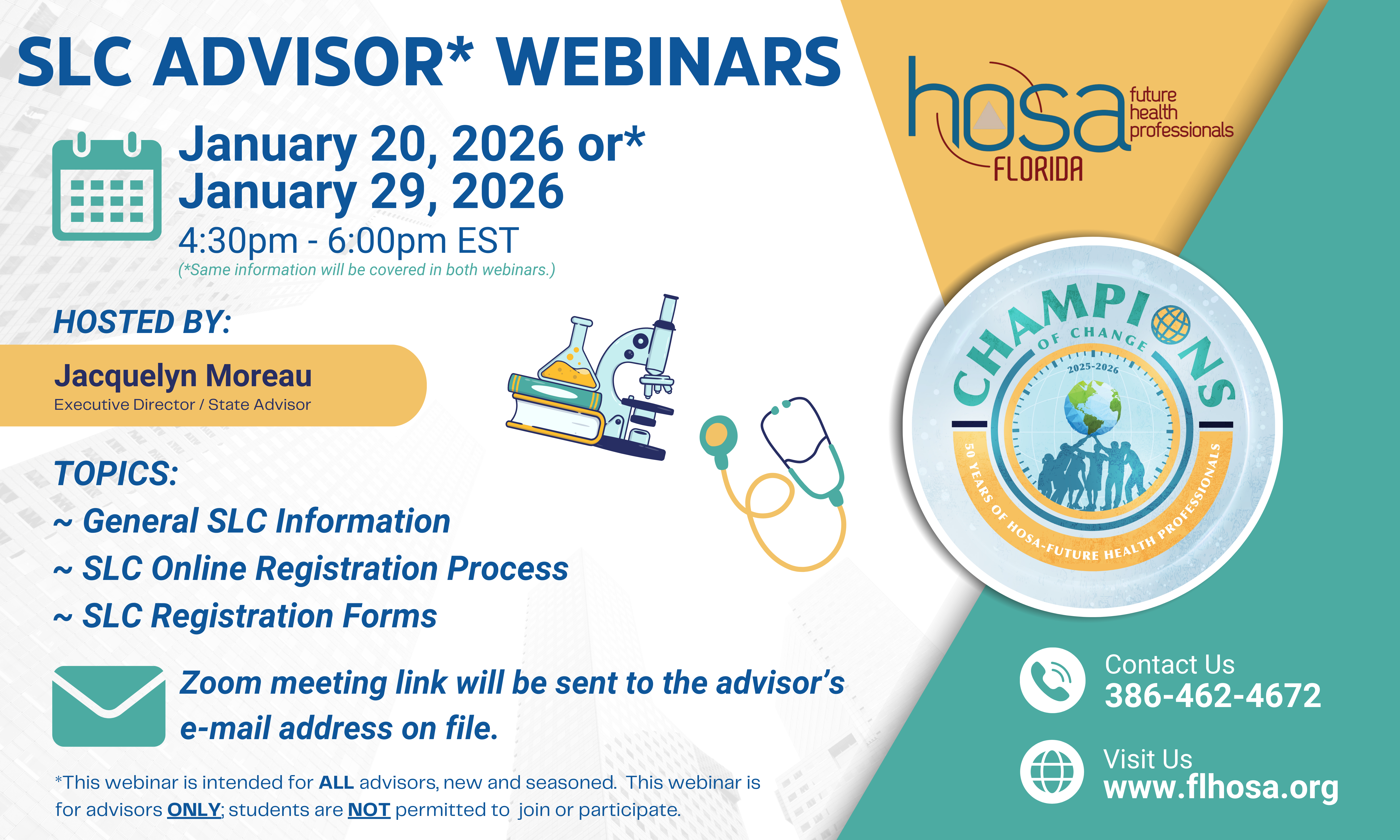 SLC 2026 will convene at the Marriott Orlando World Center April 16th – 19th. We are anticipating about 4,000 members attending to take part in exciting General Sessions, rigorous competitive events, and interactive leadership workshops! Below, please find very important information regarding our SLC. Advisors, please read the SLC Information & Instructions document, as well as the Online Registration Instructions, as both documents offer more thorough information about participating in and registering for the SLC. Also, be sure to review the Important Deadlines document, as the deadline to register for the conference is March 6th, in addition to reviewing all of the other files. Start making plans now to attend the highlight of the Florida HOSA year – our 48th Annual State Leadership Conference!